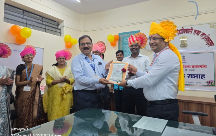 आज 1 ऑगस्ट महसूल दिनानिमित्त तासगाव तहसील कार्यालय येथे महसूल दिन उत्साहात साजरा करण्यात आला,तसेच दिनांक 1 ते 7 ऑगस्ट दरम्यान पार पडणाऱ्या महसूल सप्ताहाचा शुभारंभ करण्यात आला.यावेळी प्रांत अधिकारी मिरज श्री उत्तम दिघे, तहसीलदार अतुल पाटोळे, नायब तहसीलदार प्रकाश बुरुंगले,धनश्री स्वामी,शुभांगी सरोदे,निरीक्षण अधिकारी प्रियंका माळी यांचेसह सर्व मंडळ अधिकारी, ग्राम महसूल अधिकारी,तहसील कार्यालयातील अधिकारी, कर्मचारी उपस्थित होते.या प्रसंगी मागील वर्षभरामध्ये उत्कृष्ट काम केलेल्या अधिकारी कर्मचारी यांचा प्रातिनिधीक स्वरूपामध्ये प्रशस्तीपत्र देऊन गौरवण्यात आले.