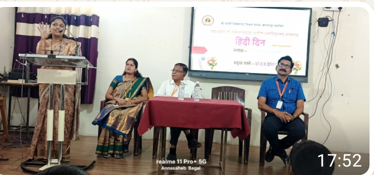 अध्यक्षस्थानावरून बोलताना ज्युनिअर विभाग प्रमुख एस.डी.पाटील यांनी हिंदीची थोरवी कथन करून हिंदी भाषेतील करिअरच्या संधी सांगितल्या.हिंदी दिनाच्या सर्वांना शुभेच्छा दिल्या. या कार्यक्रमाची सुरुवात कु.सरिता कोळी हिच्या नृत्याविष्काराने झाली.