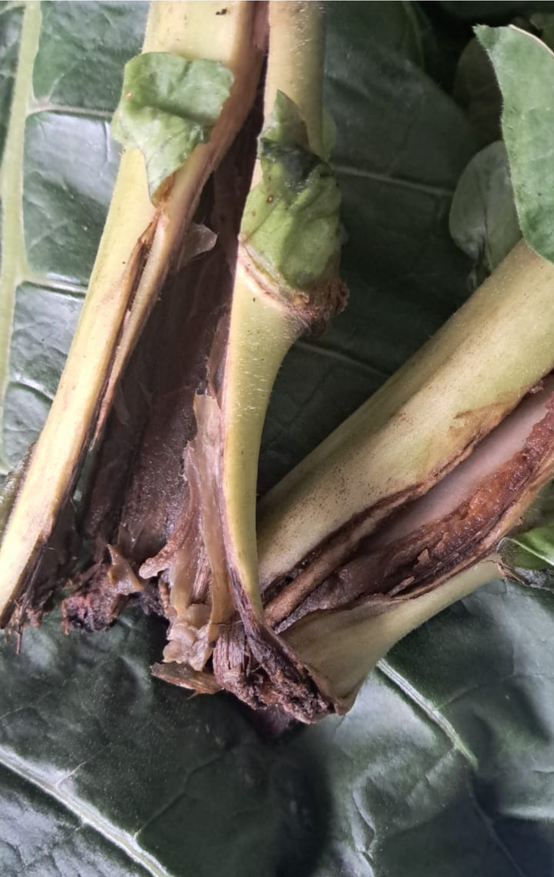 देठाच्या तळाशी मऊ, पाणचट, तपकिरी कुजलेले डाग दिसतात.