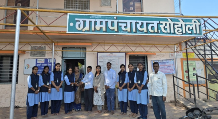 सोहोली ता. कडेगाव येथे कृषिकन्यांचे स्वागत करताना सरपंच कु. प्रणाली सूर्यवंशी ग्रामसेवक एस पी माने आणि इतर मान्यवर.